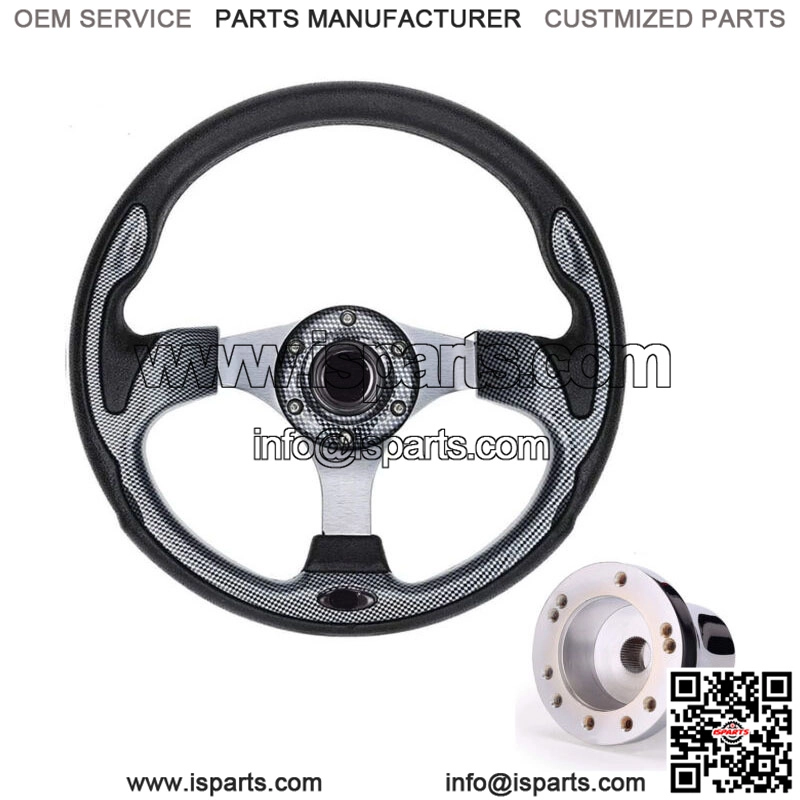 12.5inch Golf Cart Steering Wheel with 5/6 Hole Hub Adapter for EZGO TXT RXV- Golf Cart Steering wheel and Chrome Hub adapter fit EZGO TXT RXV golf cart.- Has hard aluminum spokes and Lightweight body made of PVC, 12.5 inches diameter steering wheel, A good choice to replace your old steering wheel.- Steering wheel adapters have high hardness, corrosion resistance and high temperature resistance, Made Of Electroplated Aluminum Alloy.- Easy to Install: in minutes with 5/6 hole steering wheel adapter, drilled for 5 and 6 hole steering wheels.- The decor of this golf cart steering wheel is inspired by professional racing cars. By replacing this steering wheel with its nice racing style look, your golf cart will look new and stand out on the street!- It brings a comfortable feel through the rounded and smooth grip that fits the curve of the human palm, so that your hands do not get tired of driving for a long time.- Package includes: 1x Carbon fiber Steering Wheel + 1 x 5/6 hole Chrome Hub Adapter for EZGO