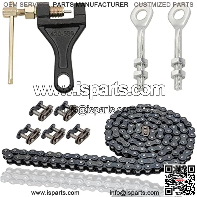 Package including 1 x 420 roller chain , 1 x chain breaker , 5 x 420 Chain Connector Link , 2 x 0.4″ chain axle adjuster