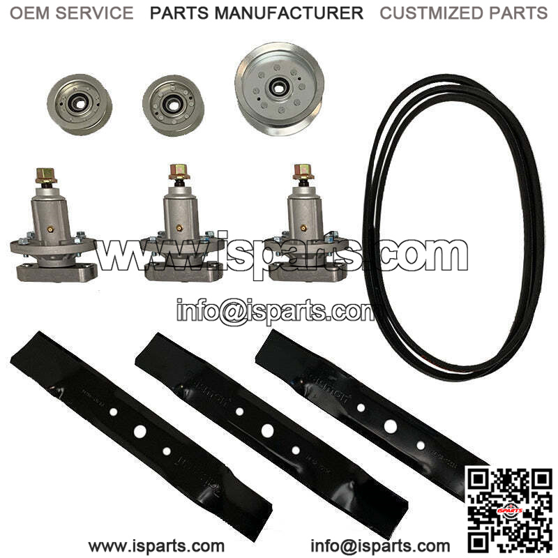 (3) SPINDLES, (3) BLADES, (1) DRIVE BELT, (2) IDLER PULLEY, (1) FLAT IDLER PULLEY