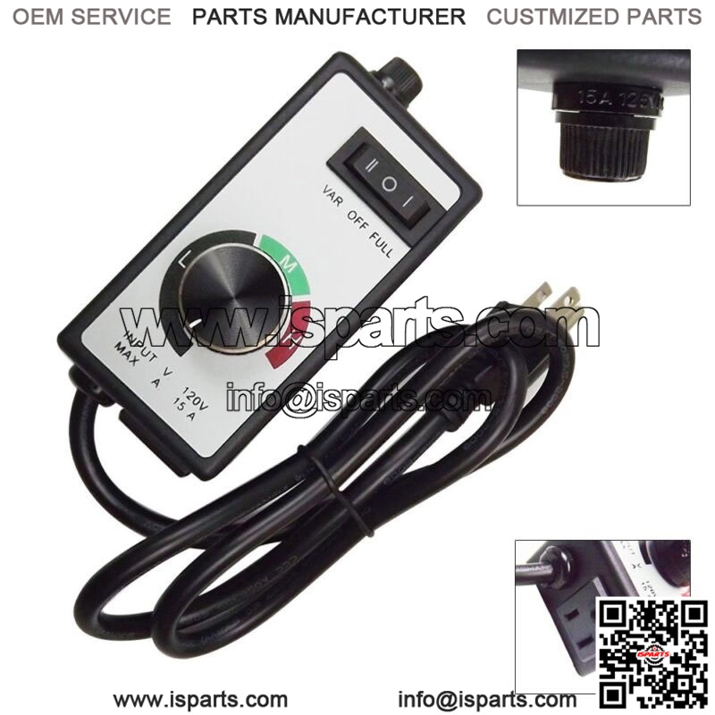 Three settings include off, on (full) and variable. Simple use the dial to increase or decrease fan motor speed. 120 volt/15 amps.