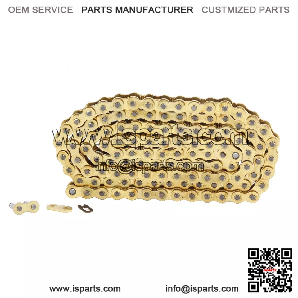 Chain: Gold, Non-O-Ring, 420×110, Tensile strength of 9600 pounds, Master link included.