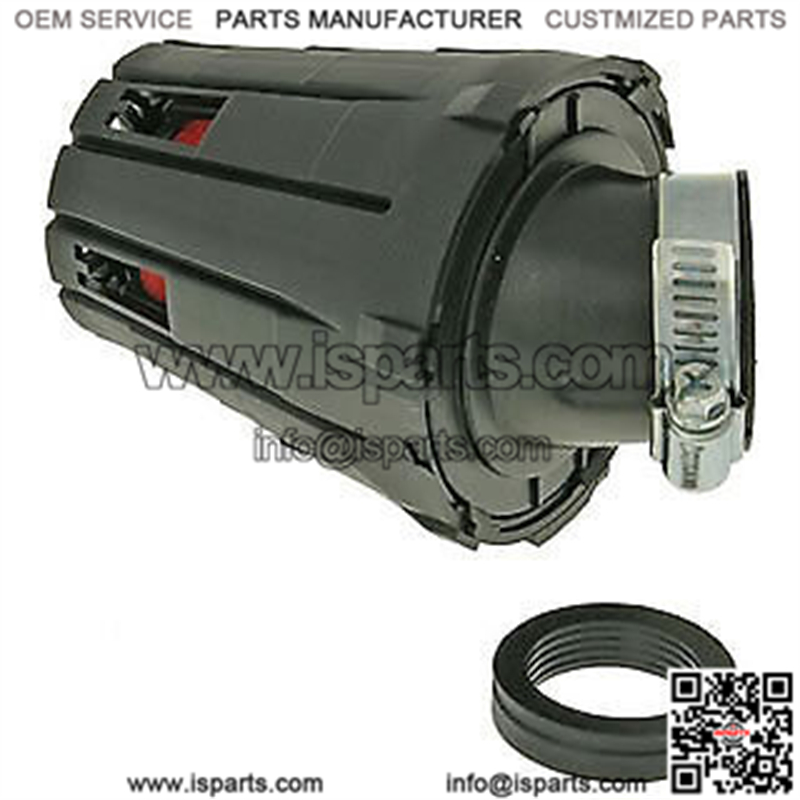 Racing filter with protective black housing and red filter. 45?? Angled carb connection for 28mm or 35mm outlet.