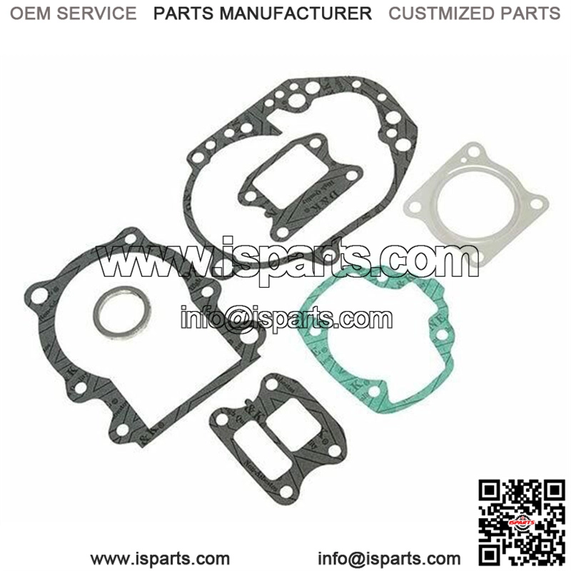 A complete gasket set, includes base, head and exhaust, crankcase, reed valve and transmission gaskets.