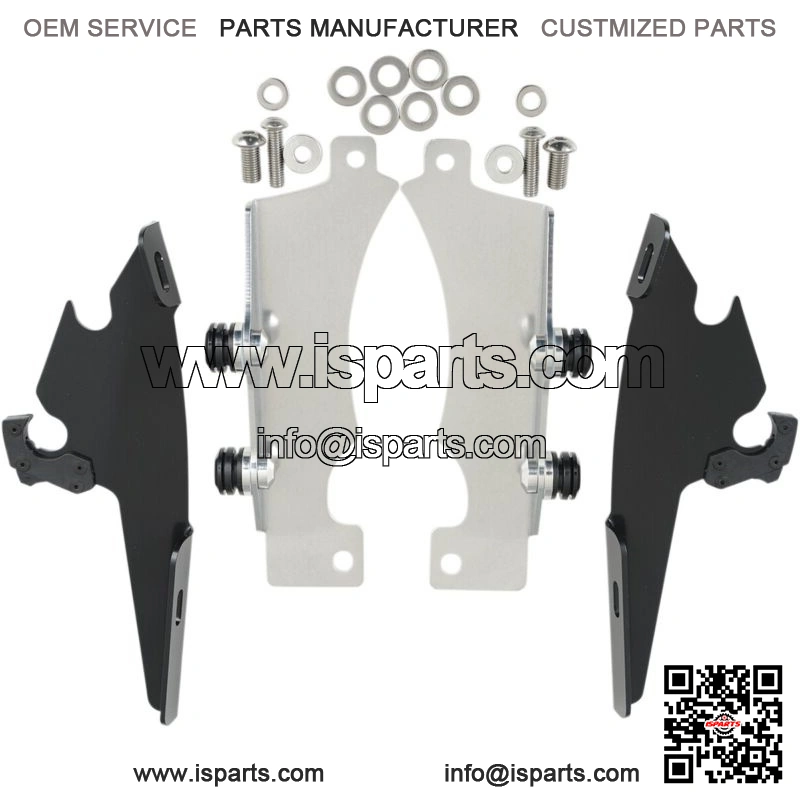 Kits are a combination of CNC-machined aluminum plates and anchors, stainless steel hardware, gray polymer bushings and glass-filled nylon latches or “Night Shades” black version which, is a gradient black windshield with black E-coated stainless steel straps, fittings and hardware for a black-on-black sinister look
