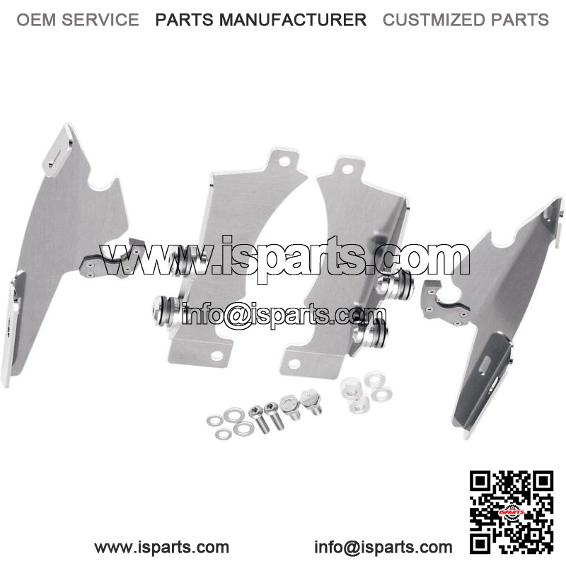 Kits are a combination of CNC-machined aluminum plates and anchors, stainless steel hardware, gray polymer bushings and glass-filled nylon latches or “Night Shades” black version which, is a gradient black windshield with black E-coated stainless steel straps, fittings and hardware for a black-on-black sinister look